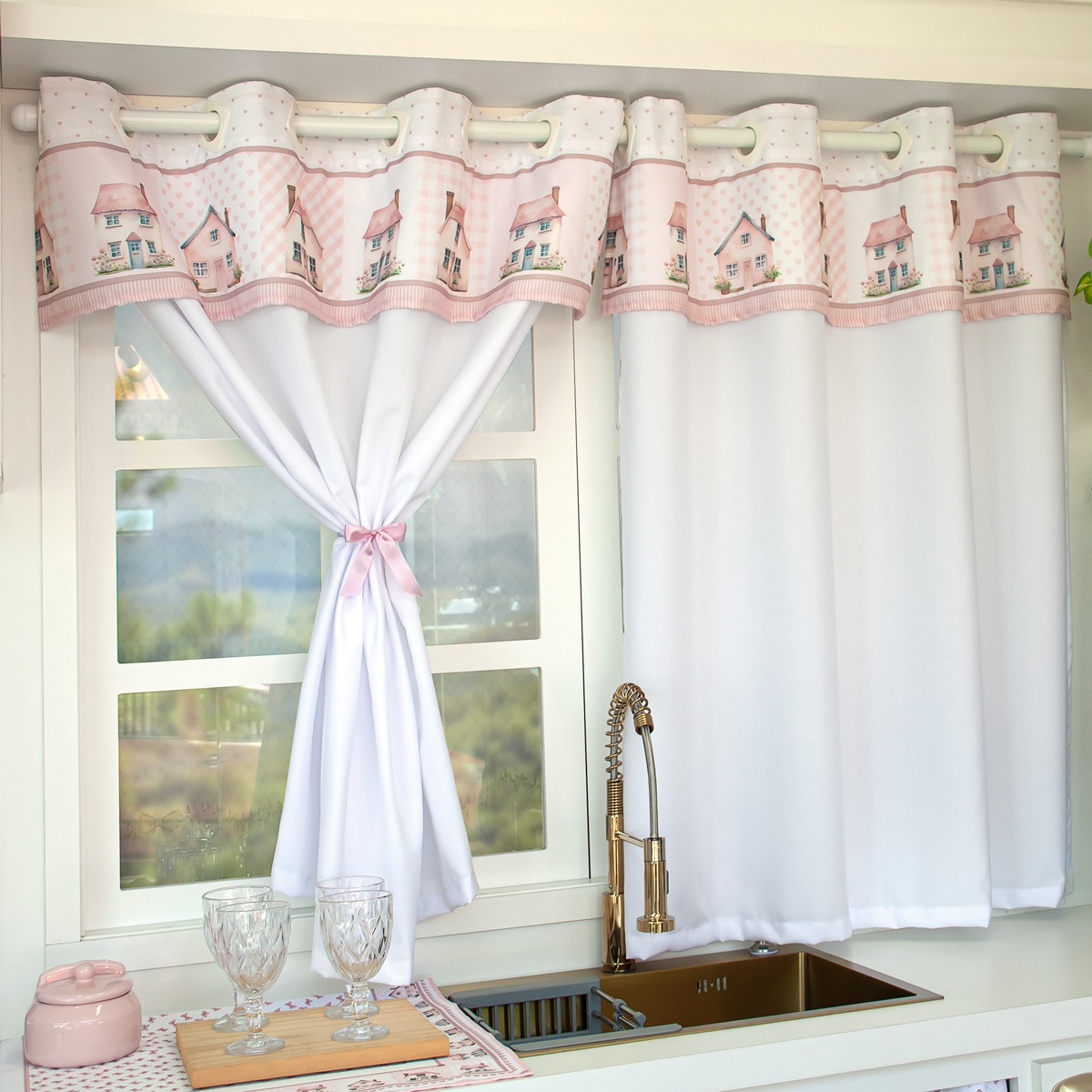 Cortina Bandô de Cozinha 2,20m x 1,20m- Coleção Digital Casinhas Rosê