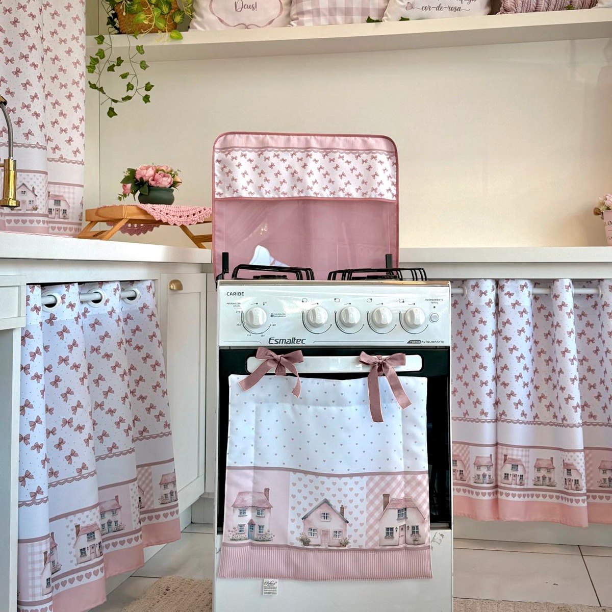 Kit Decoração Para Fogão 04 Bocas Estampa Digital Coleção Casinhas Rosê