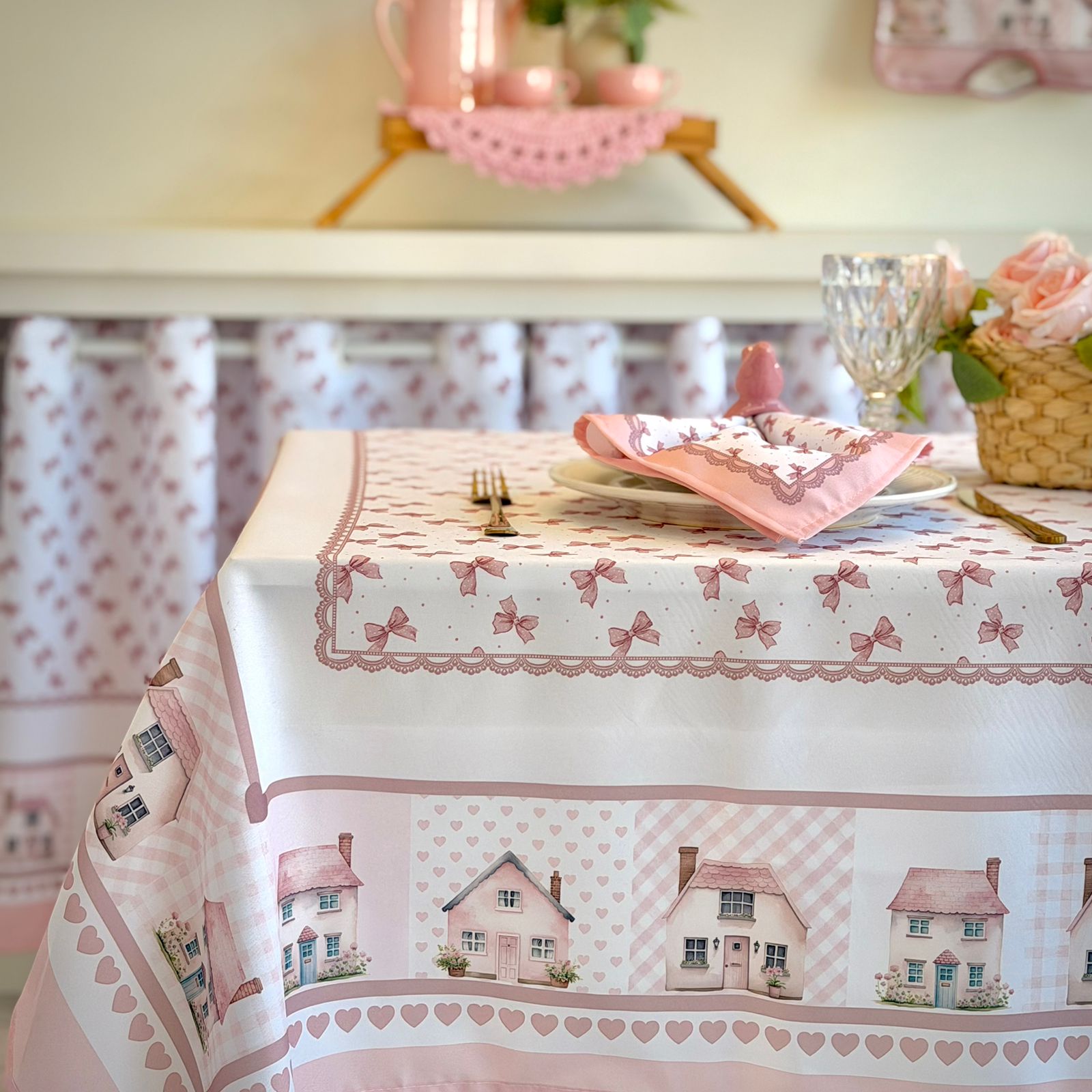 Toalha Para Mesa de 4 Lugares 1,45m x 1,35m Estampa Digital Casinhas Rosê